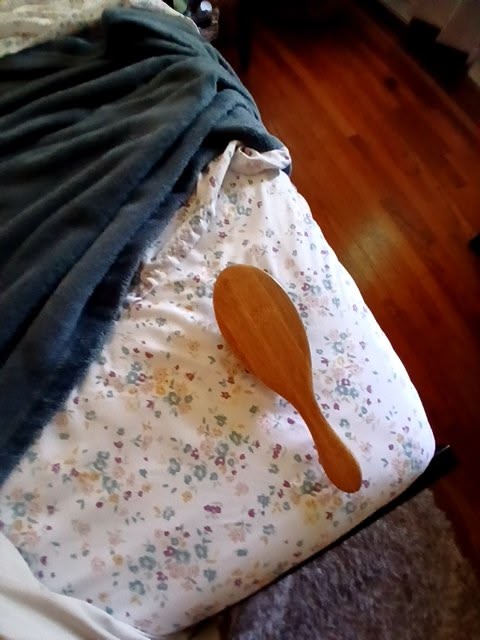 My Mother had an oval one, not too heavy. She often used her hand when I was over her lap bare of course. If she felt I needed more then the slipper would come off her foot or she would stretch over to her dressing table and take the hairbrush and use that on me.