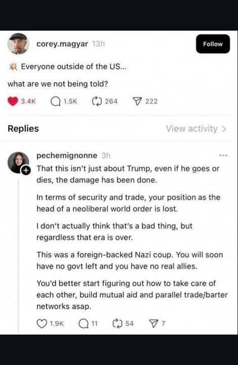 I have been telling my friends to build community because once everything is gone, we only have each other. Single people/families will not be able to survive on sheer will. You need others who can do the things you can't to build a community. That is how we became the most advanced species on earth. That is how we survived. That is how we will have to survive moving forward.