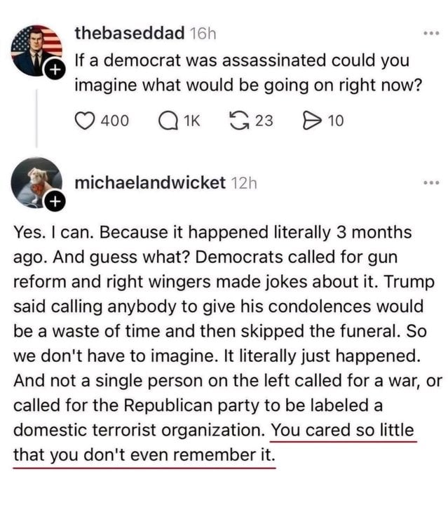 Absolutely, as has also happened with the school shooting that happened the same day as the murder of Charlie Kirk, you don't even hear anything about the school shooting. What did you hear from the democrats after Mr. Pelosi was nearly killed by a right winger?