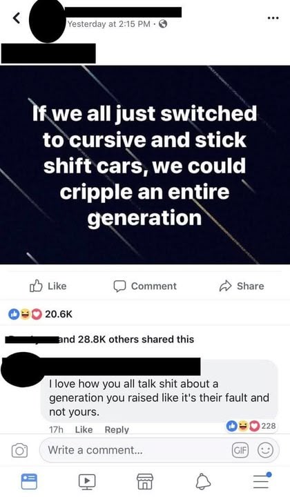Also, why do older generations want younger ones to fail? You should be wanting them to succeed. What's wrong with these people who don't think this kind of "joke" is more telling of a horrible character trait than humor?