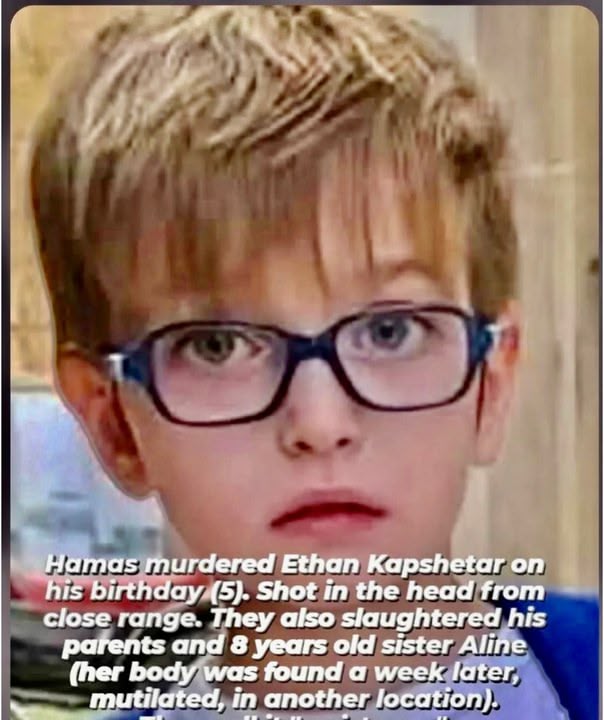 This kid and his whole family was murdered by violent terrorist from Gaza on Oct 7th 2023 also his sister who was only 8 years old was taken away from the home and left for dead miles away after being brutalized in unspeakable ways .. we will not forget the horror of this intentional and barbaric attack nor will we allow the world to forget or excuse this evil madness that drives people to this lvl of personal physical hate and violence.. this is wrong and the world is failing to condemn it but rather excuses and ignores it again