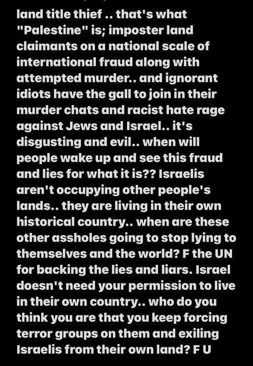 @22Michelle that's ignorant misinformation propaganda.. Israelis have ancestral roots in the land going back thousands of years and the fake "palistianias" are trying to uproot them and deny their rights to the land and their history.. you should go learn something and stop following false media outlets that scream lies and misinformation FYI