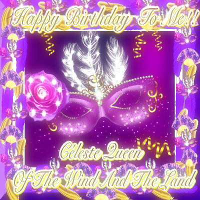 Memories: Hermoso antifaz dorado con rosas Violetas y plumas blancas doradas destellantes y serpentinas de Mi Cumpleaños 2019.