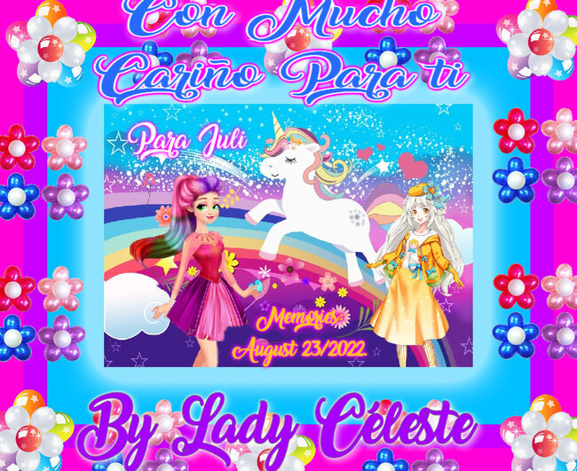 "Junto a mi hermanita Juli celebrando en su Cumpleaños 23 de Agosto del 2022, en mi reino celestial junto a uno de nuestros compañeros mágicos mi Unicornio Arcoiris".