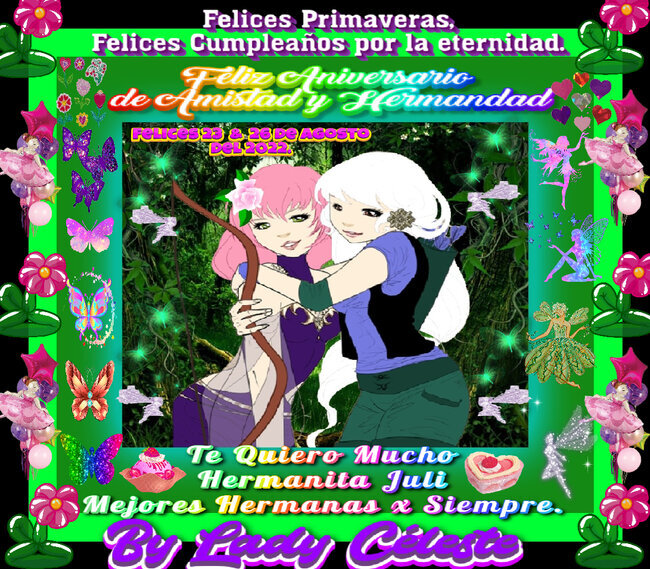 "En el bosque mágico de las hadas, nos tomamos una foto celebrando nuestro Aniversario de Amistad y hermandad que es un 26 de Agosto y también celebrando el Cumpleaños de mi grandiosa hermana Juli, espero que os haya sido de agrado todos estos presentes y ofrendas que os hice con mucho cariño en honor a ti y a nuestra hermosa Amistad y Hermandad que considero verdadera y especial, os quiero y amo mucho hermanita Juli".