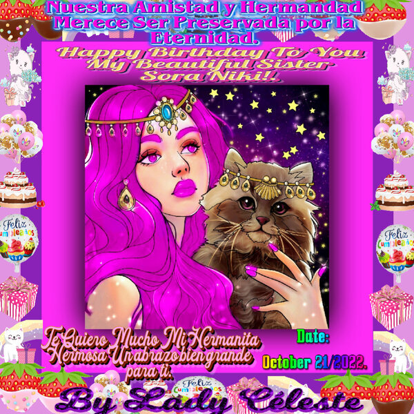 Nuestra hermanita Sora, disfrutando de un hermoso paisaje nocturno, en sus hermosos atuendos de princesa Felina, me agrada mucho como tenéis adornado vuestro cabello, muy lindo y frondoso, también me encantan las joyas que tenéis en vuestras orejas y larga cabellera, sosteniendo uno de tus adorables guardianes mininos a la luz de las estrellas.
