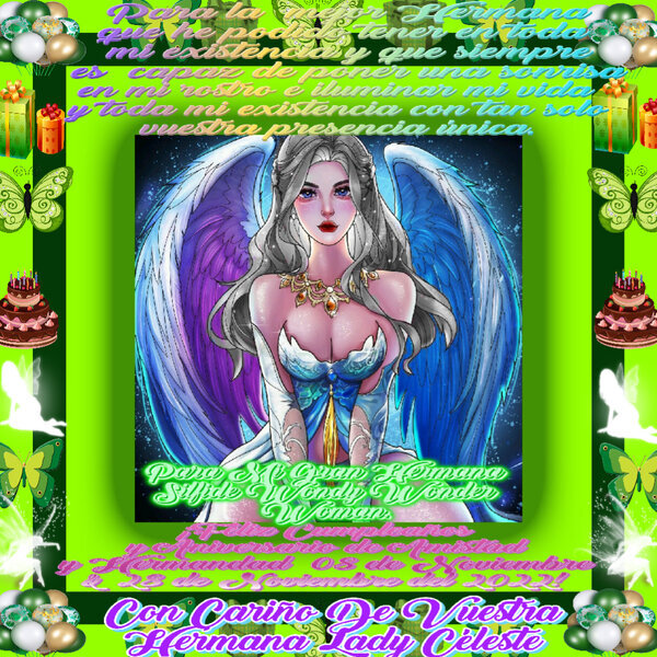 ¡Una ofrenda alada de Cumpleaños, haciéndome recordar y apreciar por siempre en mi corazón que eres como una ángel celestial en nuestras vidas, que siempre nos impulsa a seguir a adelante, en verdad os amamos mucho y deseamos lo mejor en vuestro Cumpleaños hoy y siempre, de parte mía y de toda vuestra familia Souvenir Ma Famille Le Jardin Des Meilleurs Amis, Comunidad Iorbix a Nivel Mundial, para nuestra gran hermana del alma Wondy!.