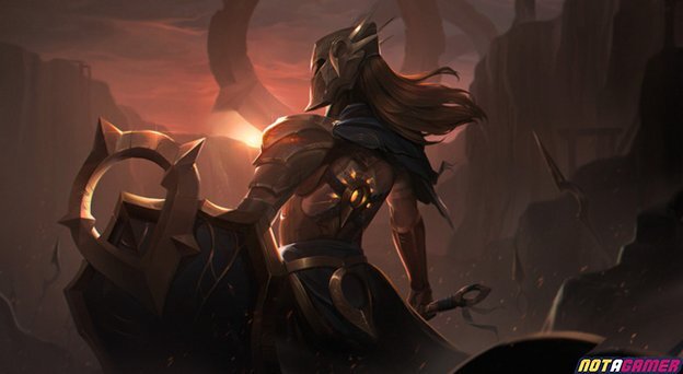 El líder levantó su callosa mano al ver una solitaria figura parada al otro extremo de la calle del asentamiento. Sonrió cuando notó que era una mujer. Al fin, algo valioso que saquear. Estaba envuelta en luz, y la sonrisa abandonó su rostro cuando pudo ver más de cerca que la mujer iba ataviada con una placa de guerra ornamentada. Su cabello rojizo caía desparramado de una diadema dorada y la luz del sol emanaba de su pesado escudo y larga espada.