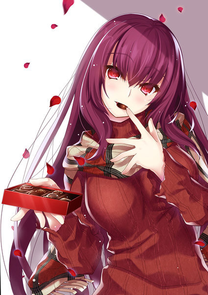 -El color de las mejillas se vuelve mas brillante cuando los labios de ambos se rozan y finalmente el chocolate es degustado por ambos, aunque Scathach no puede alejar sus dedos de sus labios-