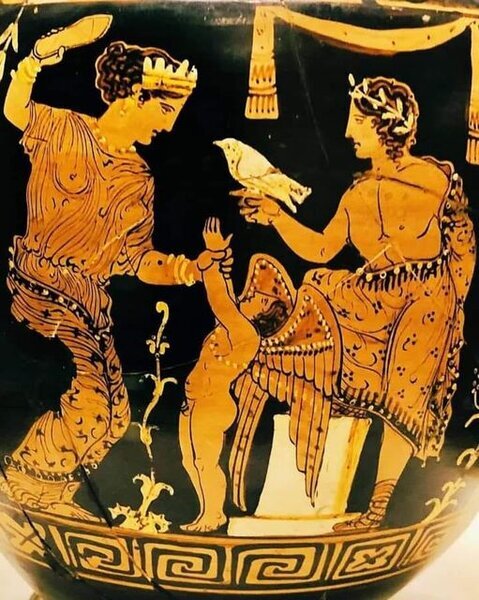 Regañando al pequeño Eros con la chancla por andar haciendo travesuras (?)