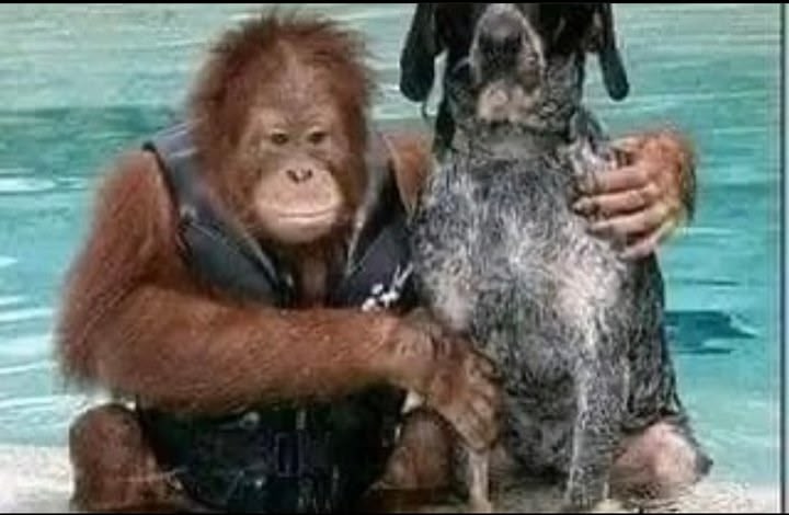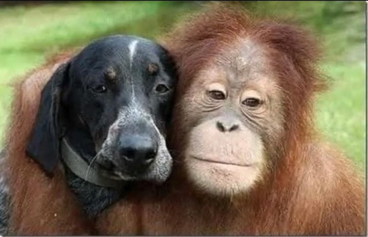 The zookeepers found an old sick dog on the grounds in the park at the zoo where the orangutan lived and took the dog to the animal treatment centre. The dog arrived at the same time Roscoe was there being treated.