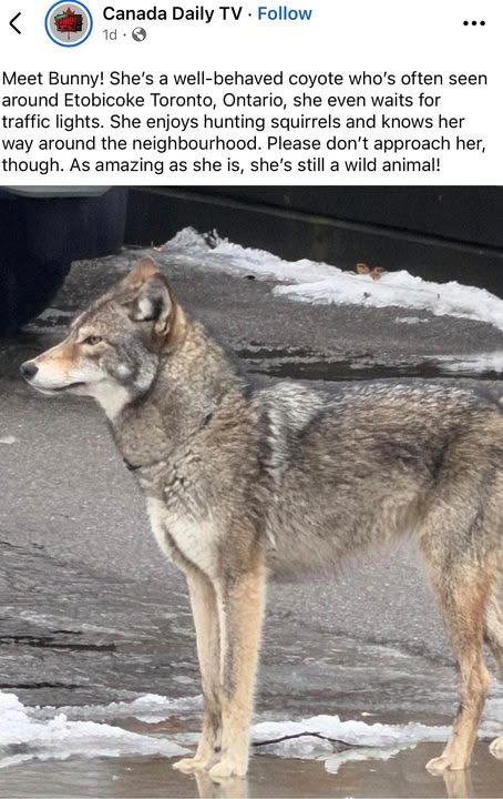 A coyote roaming sidewalks in Toronot, even Etobicoke blows my mind. It just feels weird, like a coyote in Staten Island or something