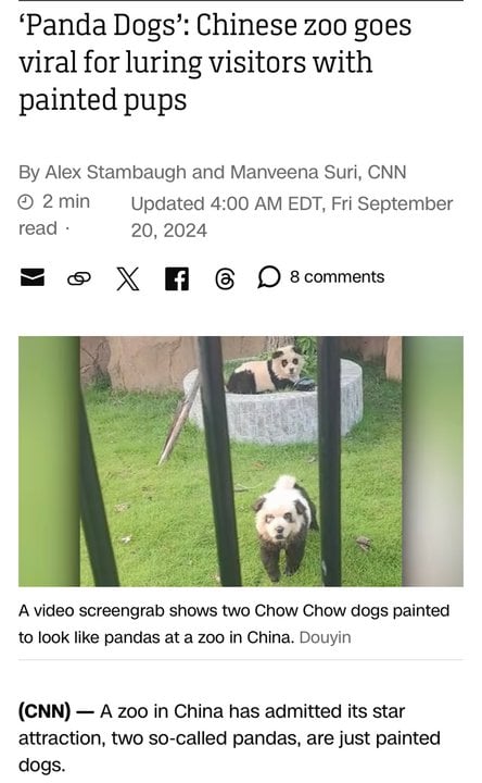 Not one but TWO Chinese zoos have been accused of and have admitted to painting dogs to look like pandas and displaying the painted dogs as pandas.