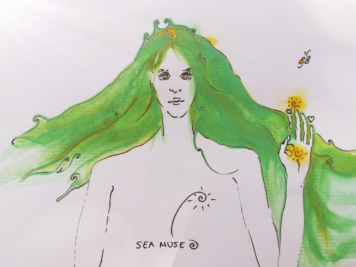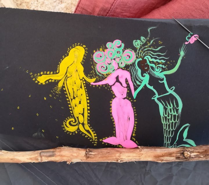 I’m intrigued by the sea sprites or mermaids on the black backround. Reminds me of college days with black light posters! Love it!!!