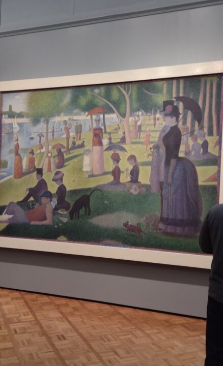 Georges Seurat's A Sunday Afternoon on the Island of La Grande Jatte. i was inspired to paint a follow-up with less people and i call it "earlier that afternoon"