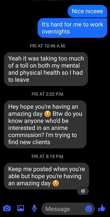 I get that ALL the time on Instagram. Once I had someone ask me if I would buy some art. I did. Used up the last of my money. And when I got the artwork, she insisted I KEEP buying.