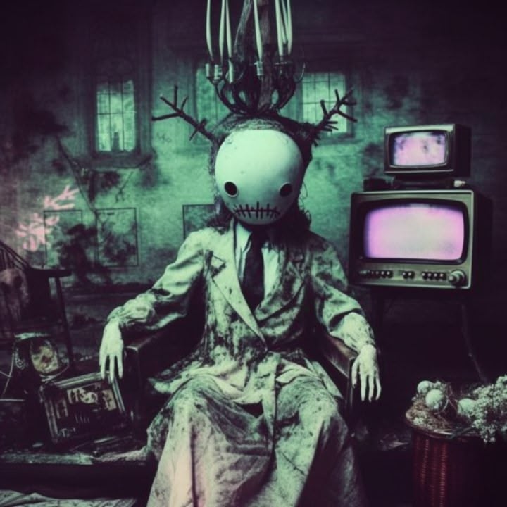 The Guest didn’t move. It didn't breathe. It wore a suit that looked like it had been buried and exhumed, and a mask that resembled a giant, bleached egg stitched shut with iron wire. The "antlers" weren't bone; they were petrified wood that had grown through the floorboards, and the chandelier on its head flickered with candles that never melted down.