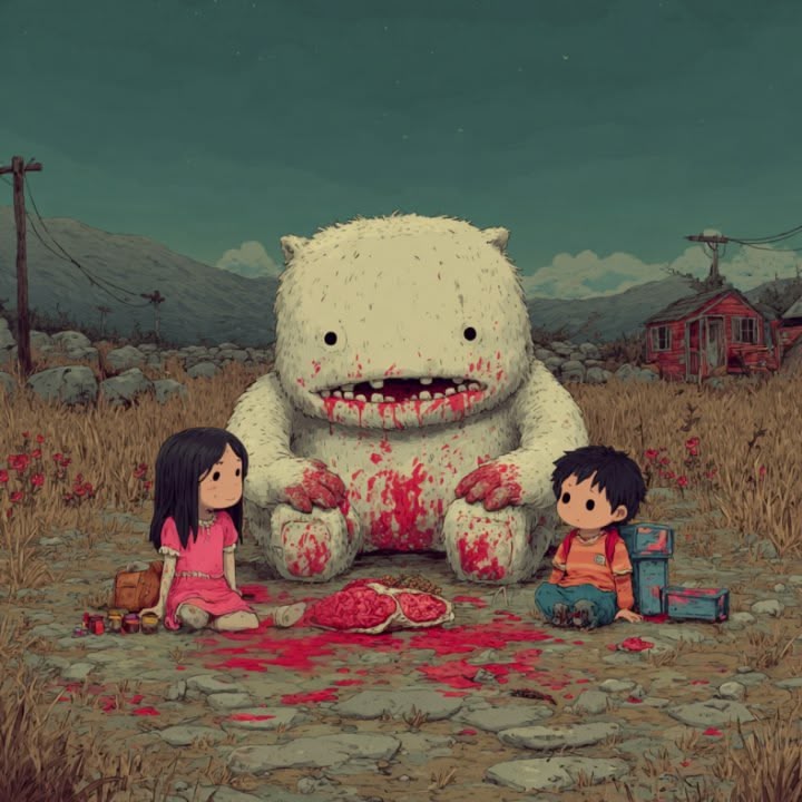 The children were lost in the scrublands after their village was reclaimed by the dust. They found the big guy trapped—perhaps in a rusted pipe or a sinkhole—and shared the last of their dry crackers with him. He had never tasted kindness, only the cold wind. In exchange for those few crumbs, he dragged himself out and brought them a fresh kill an hour later. They’ve been moving together ever since, a trio of orphans who decided that being full was better than being alone.