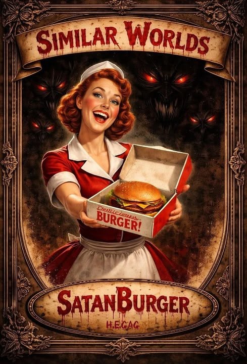 Something with the female offering you a burger and then the eyes in the background. Like it's getting to hypnotize you and secretly steal your soul once you eat it which to be fair is probably something I'd do 🤭