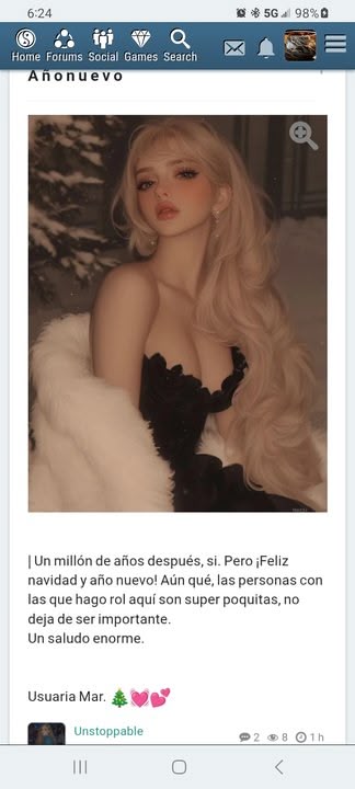 A ñ o n u e v o | Un millón de años después, si. Pero ¡Feliz navidad y año nuevo! Aún qué, las personas con las que hago rol aquí son super poquitas, no deja de ser importante. Un saludo enorme. Usuaria Mar. 🎄💓💕 Post Comment Receive notifications Add a comment...