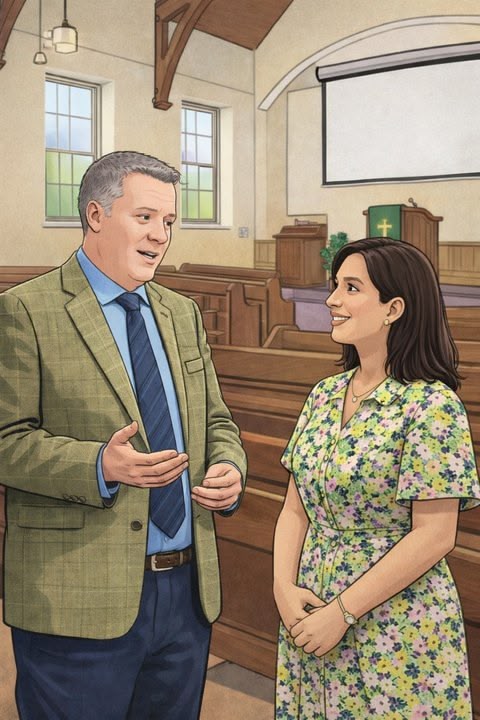 Ok-ish cartoon of my pastor (in RL he looks younger and has a slightly different face structure but the suit is bang on) and generic Iranian woman to show you the scene above.