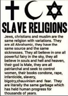 SLAVE RELIGIONS Jews, christians and muslim are the same religion with variations. Post Comment Receive notifications Add a comment...