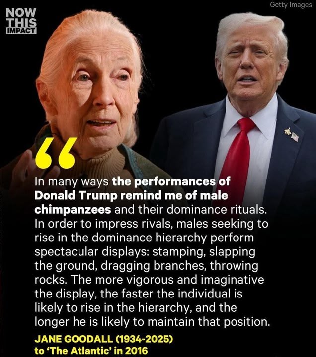 Goodall, renowned for her chimp field research and environmental advocacy, in 2022 told MSNBC’s Ari Melber that Trump displays “the same sort of behavior as a male chimpanzee will show when he’s competing for dominance with another.”