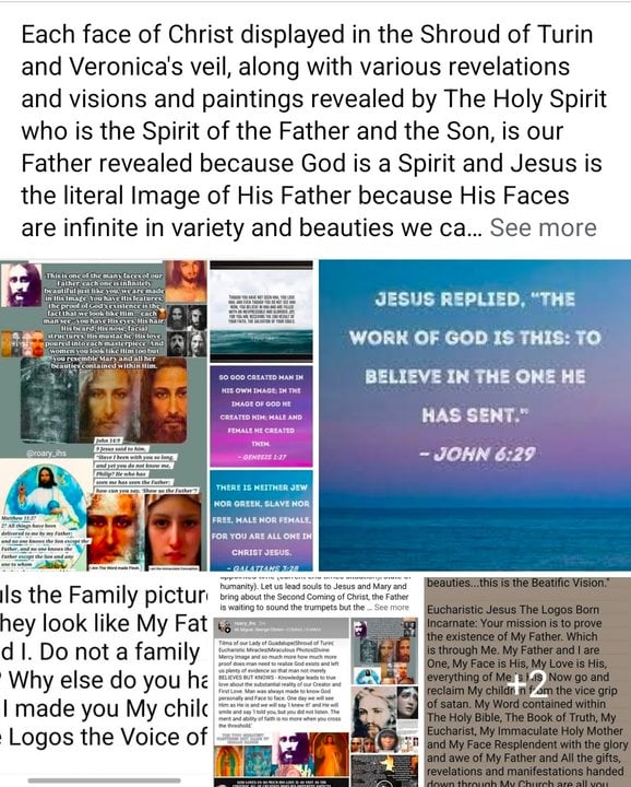 Each face of Christ displayed in the Shroud of Turin (https://www.shroud.com/) and Veronica's veil, along with various revelations and visions and paintings revealed by The Holy Spirit who is the Spirit of the Father and the Son, is our Father (https://eucharisticmarianremnantarmy.blogspot.com/2025/12/paradisical-locution-from-god-father.html) revealed because God is a Spirit and Jesus is the literal Image of His Father because His Faces are infinite in variety and beauties we cannot behold until we reach the Beatific Vision as revealed to me. That is a secret I was not expecting to receive I am so happy we get to enjoy His Face in all its beauties and splendor forever and it will always be new...God is infinitely creative. This is the best early Christmas gift!!!