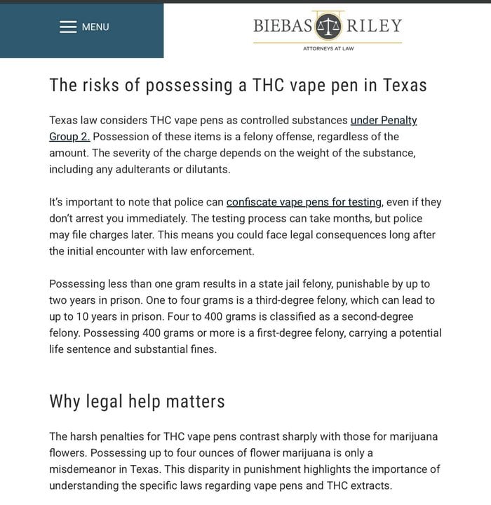 In some states, such as Texas, possessing a THC vape pen is treated as a felony, even for small amounts, because THC oil is classified as a concentrated controlled substance. Penalties can range from months to years in prison and substantial fines, depending on the amount.