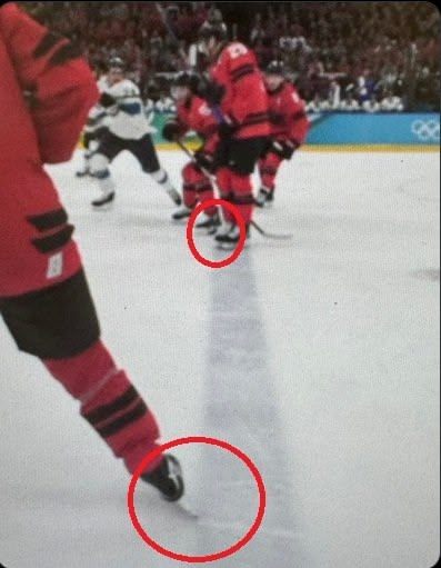 Look at his skate in the bottom of the image. He is inside before the puck crosses. Strangely they zoomed in on the picture they are showing so you can't really see it. Cheating on a different level.