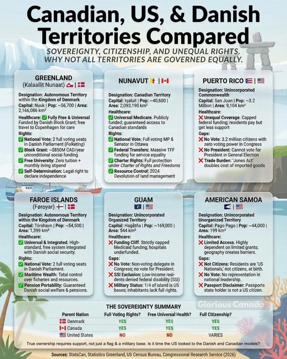Sovereignty isn't just about whose flag or military base is on the map. It’s about who has your back when the cost of living in the middle of the ocean gets too high. And right now, the North is showing the world that equality isn't just a mainland luxury—it's the only way a Kingdom, or a Country, actually stays together.Greenland Canada is a logistical nightmare (that's why it's retained it's sovereignty sofar), and then there is King Winter, the defenders protective saint.Americans probably put a kill switch in all the F35. So that if you attack them, you're going down as well. down