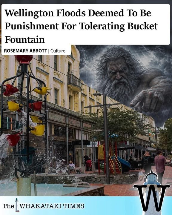 After days of relentless rain and flash flooding, the so-called “art installation” known as the Bucket Fountain on Wellington’s Cuba Street is being blamed for “angering some kind of deity”, which may have been either Ranginui or Zeus.
