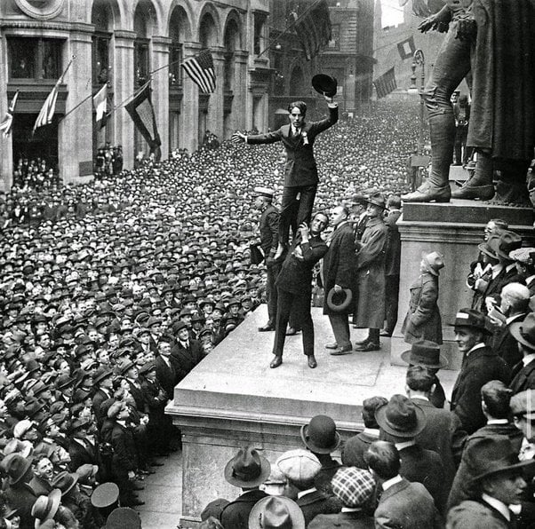 In 1918, Charlie Chaplin stood on Wall Street in New York City, drawing a massive crowd of 20,000 people. Post Comment Receive notifications Add a comment...