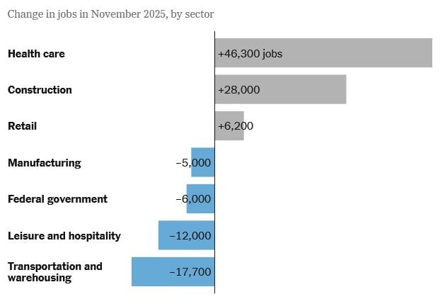 From this chart I gather that the US needs more healthcare, likely related to being unemployed. Also since healthcare insurance is being destroyed the hospitals stand to take way more of your money, so they are boosting staff to get ready. I wonder what the construction industry are building? More prisons perhaps? Retail jobs went up, probably all the government workers finding a way to pay the rent. Manufacturing down since most of the world are not buying US products. Government workers axed. Leisure and hospitality down a lot due to paranoid border changes keeping tourists away. Transportation and warehousing is the biggest hit. Not sure how to explain that one.