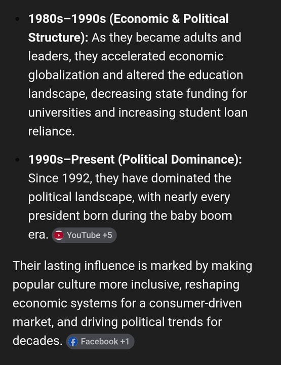 @bijouxbroussard to be fair, many people during the peak of this iniitial period (Civil Rights Act, birth of rock and roll, the first LGBT bill to become law, et al.) — such as MLK Jr., John Lewis, Betty Friedan, LBJ, JFK, Earl Warren, John Conyers, Chuck Berry, Sister Rosetta Tharpe — were not boomers, but from the "Silent", "Greatest", "Lost" and "Interwar" generations