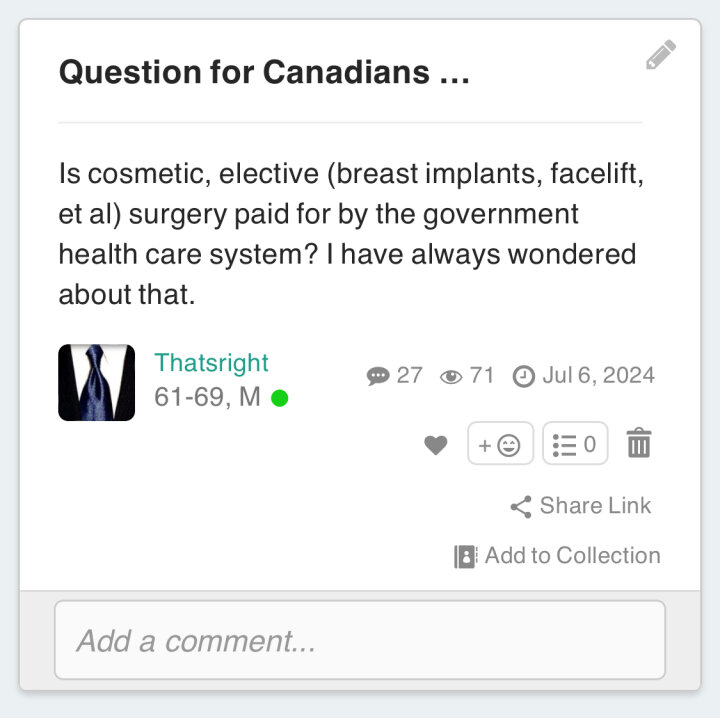 So, socialized medicine does not pay for ELECTIVE cosmetic surgery. But they do pay for corrective cosmetic surgery due to accidents, disease, birth defects or similar items. If you just want a bigger or smaller tou have to pay for it. And the doctors up there have the expertise from corrective surgery they perform.