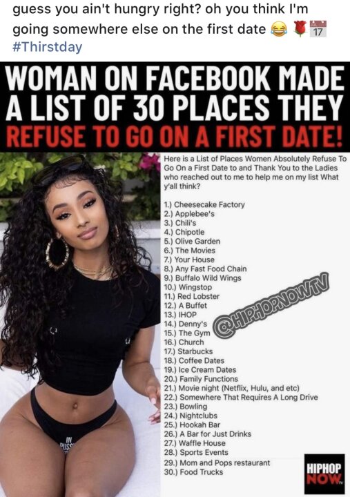 Golddigger is on FB made a list of 30 places they refuse to go on the first date honestly, the only thing I probably would refuse a sushi, but, I everything else of type of foods I wouldn’t mind