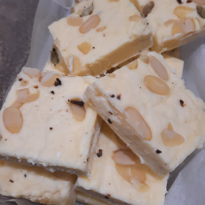 This sweet popular among Punjabi people is known as burfi (barfi). It is normally made using ghee, a bit of milk, milk powder and powdered sugar.