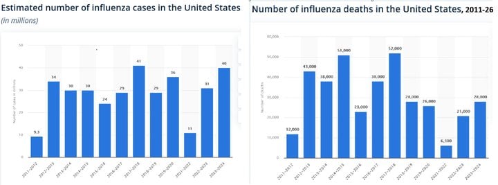 Don't get too fixated on deaths alone; influenza can have death rates that can vary by factors of 2 or more from year to year, depending on the strain.
