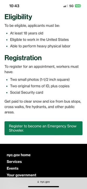 Now in preparation to deal with the expected heavy snow, Mayor Mandan has put out a call for volunteers, those who might want to earn $$$ by shoveling snow in the city. Chuck Schumer, NY Senator, a Park Slope Brooklyn resident must be livid ( I’m being sarcastic) over the requirements/ eligibility that to shovel, needs to be met…