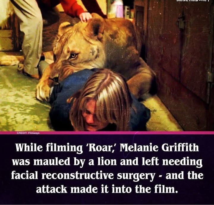 Melanie Griffith was mauled by a lion during the filming of the 1981 movie Roar. The incident, which occurred on the set of the film starring her mother Tippi Hedren, required her to have over 50 stitches and reconstructive surgery on her face. The film is known for the real-life injuries sustained by the cast and crew, as they worked with large, untrained big cats.