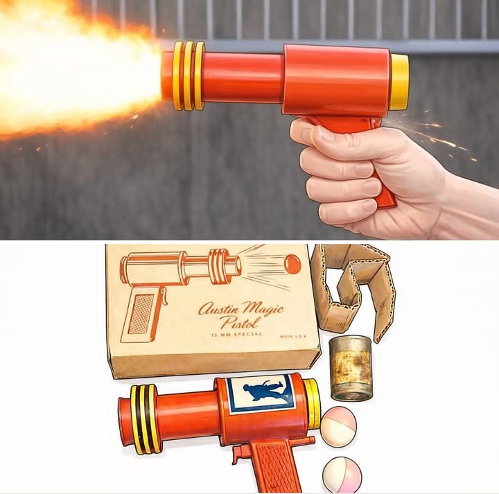 The Austin Magic Pistol was a late-1940s toy gun that basically turned kids into backyard artillery crews. It fired ping-pong balls using a small gas explosion rather than a spring or compressed air.