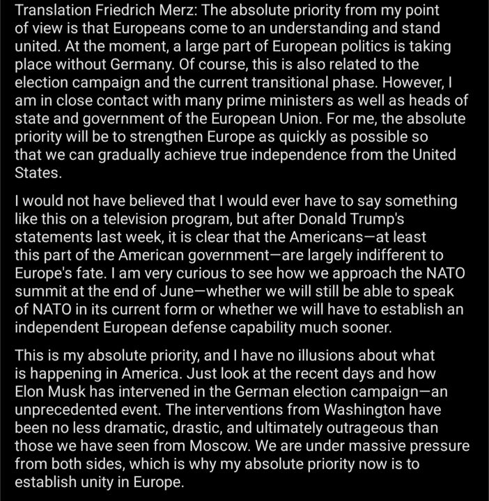 And he will now try to form a coalition with the outgoing chancellor's SPD. When Trump realises they are cooperating to keep the Musk-backed AfD out of the picture, I think he is going to be bigly displeased 😬