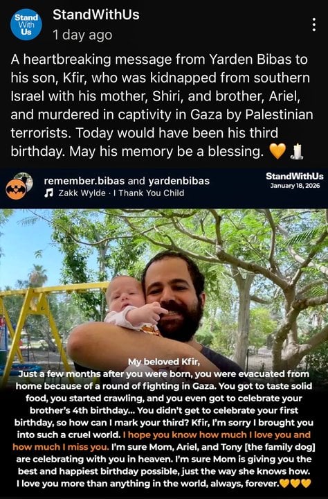 Yesterday would have been Kfir Bibasโ 3rd Birthday ๐ But he and his mother and brother were all killed in Gaza after being kidnaped and held by terrorist there.. ๐ Post Comment Receive notifications Add a comment...
