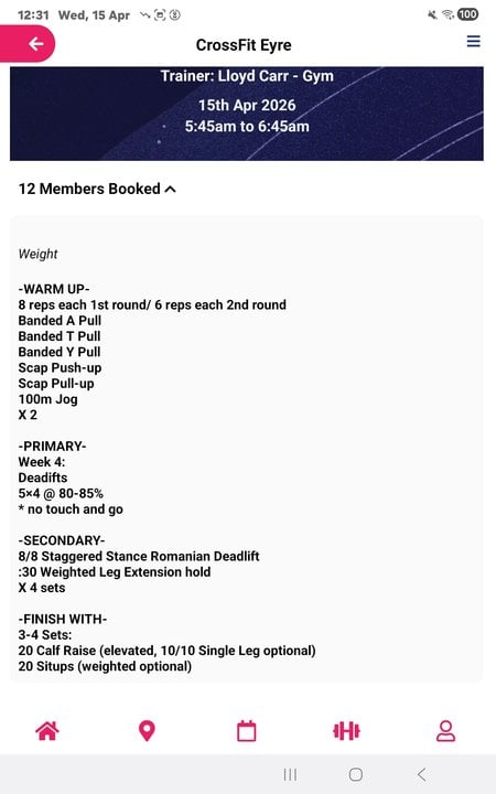 CrossFit WOD April 15Wednesday Happy Hump Day Battery🔋 restored to maximum power21.8 degrees C and Sunny 🌞 ASX200 8,978.70 +7.90 (0.088%)today Treading Water Deadlift focus Post Comment Receive notifications Add a comment...