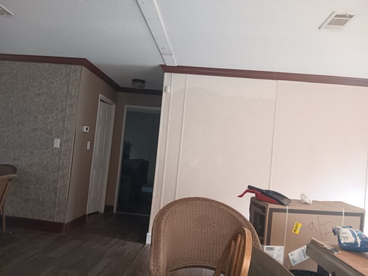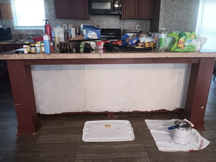 Even as I am going to wheelchair with an open wound I still decided today with some extra energy to help the painter along so that we can get this project done efficiently and up to par to bring life back into the house. I decided to go with a little bit different color scheme on the island I am leaving the columns dark and the edging dark but the main body is going to be light 10 to match the walls. And I put a first coat on some final walls in the living room space today as well and the edges door frames window trim and baseboard will be the dark red cherry. I had to stop though because my foot and leg swell up a little bit and started to hurt but I am helping get it done because I am determined