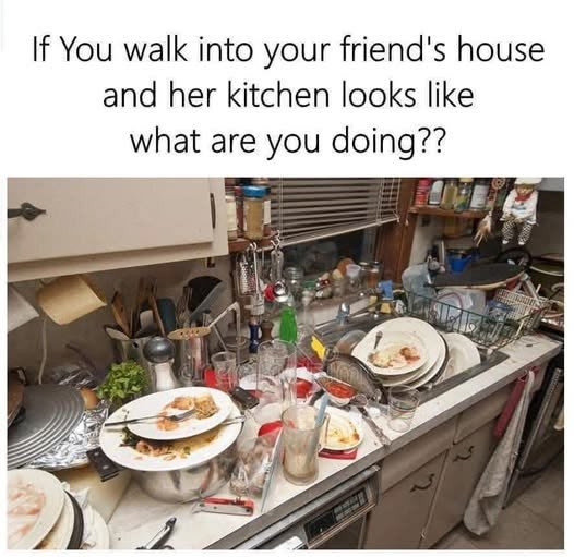 I would figure she was completely overwhelmed and overworked, and I would help her, unless of course a meal has just been had. Then I would just offer to help. My family is large. There have always been at least 6 of us here, and my kitchen has looked this messy after cooking everything from scratch and eating. However, the kitchen is always clean within an hour of eating. 🤷♀