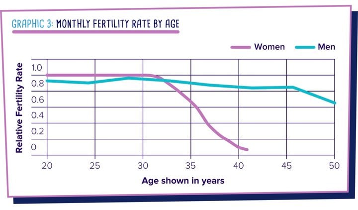 Graphic 3 shows that on average there is a decline in female fertility starting in the mid-thirties, with lower fertility especially after the age of 35. Women’s fertility will continue to decrease every year, whether or not she is healthy and fit because the number and quality of the eggs decreases with age. Even if a woman is not ovulating (for example if she is taking the contraceptive pill, or is pregnant), the number of eggs continues to decline at the same rate. How quickly a woman’s fertility declines will depend on a combination of genetic and lifestyle (e.g. smoking) factors.
