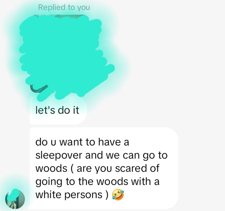 This white persons is also scared of going into the woods with that white persons