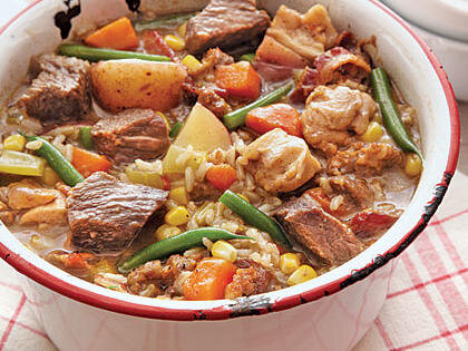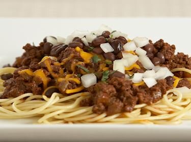 Coming from the most chili-mad city in the United States after Texas, Cincinnati chili is a popular dish made with ground meat, stock, and unusual spices such as cinnamon, allspice, Worcestershire sauce, and chocolate or cocoa. The chili is usually served over pasta such as spaghetti, then topped with a flavorful combination of shredded Cheddar, fried beans, onions, and crushed oyster crackers.